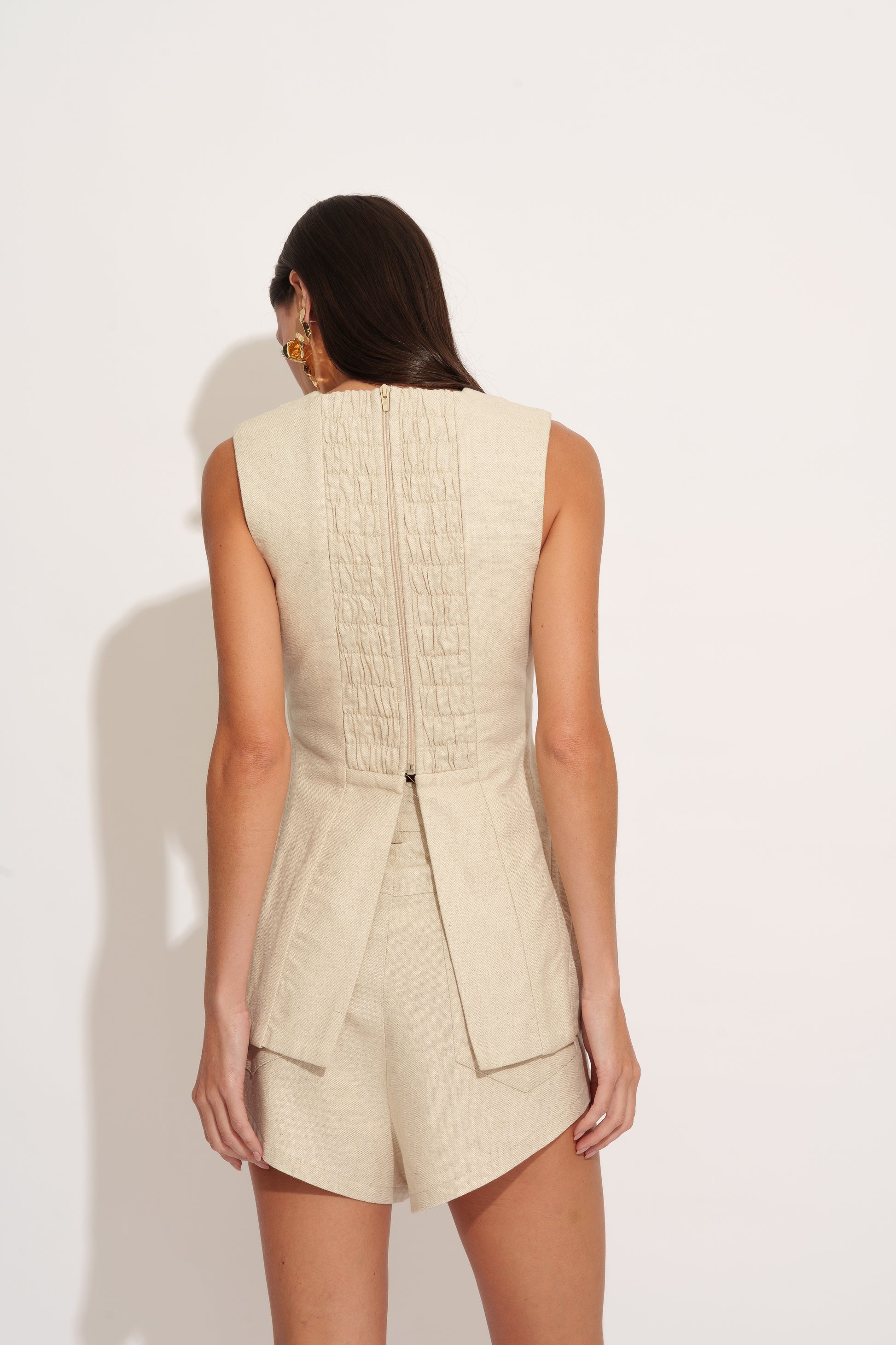 Blusa com decote V, alça larga e detalhe estruturado no quadril, possui elástico nas costas e zíper. Confeccionada em linho com algodão.