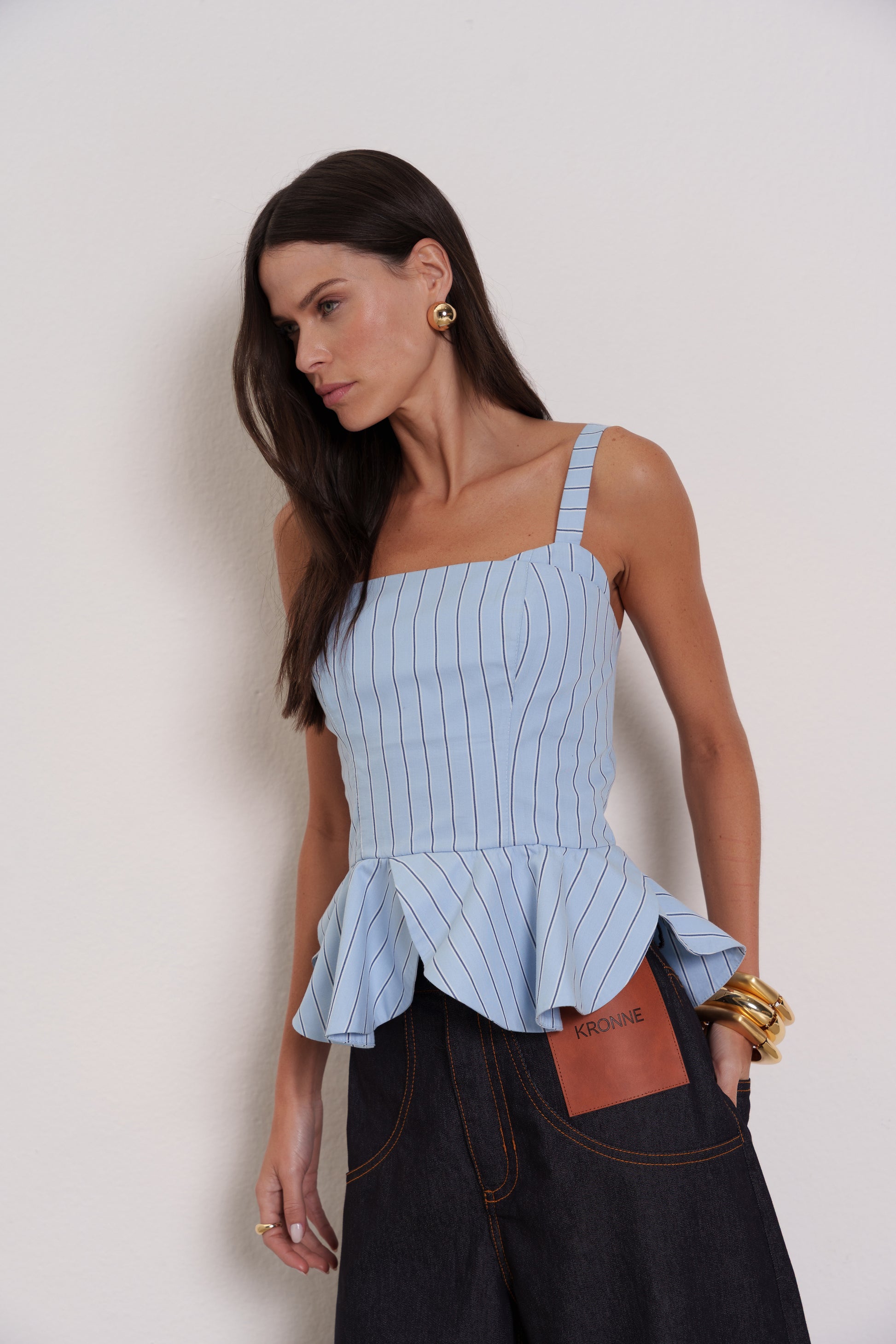 Blusa com alça e peplum na barra, possui elástico nas costas e fechamento por zíper. Confeccionado em tricoline.