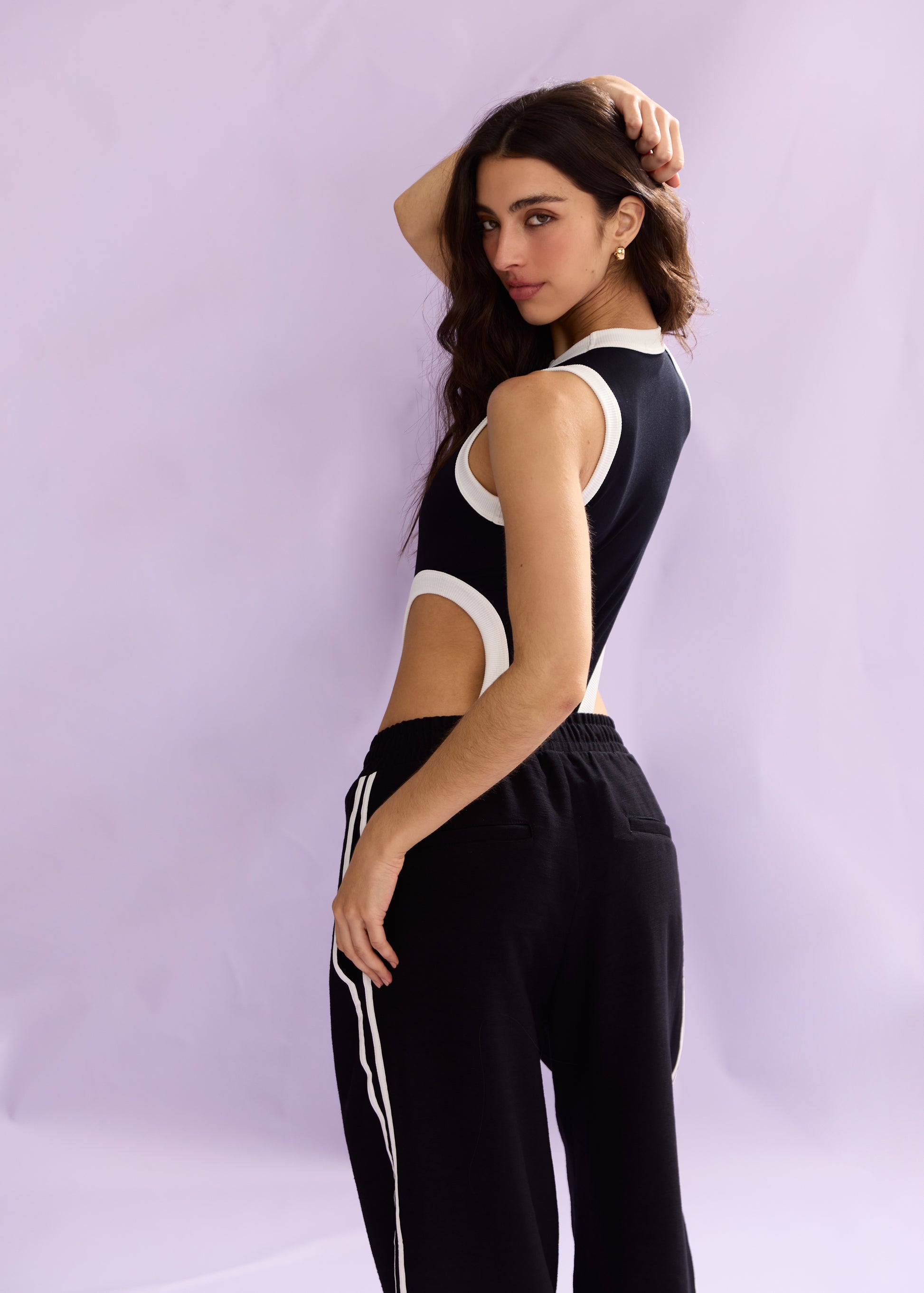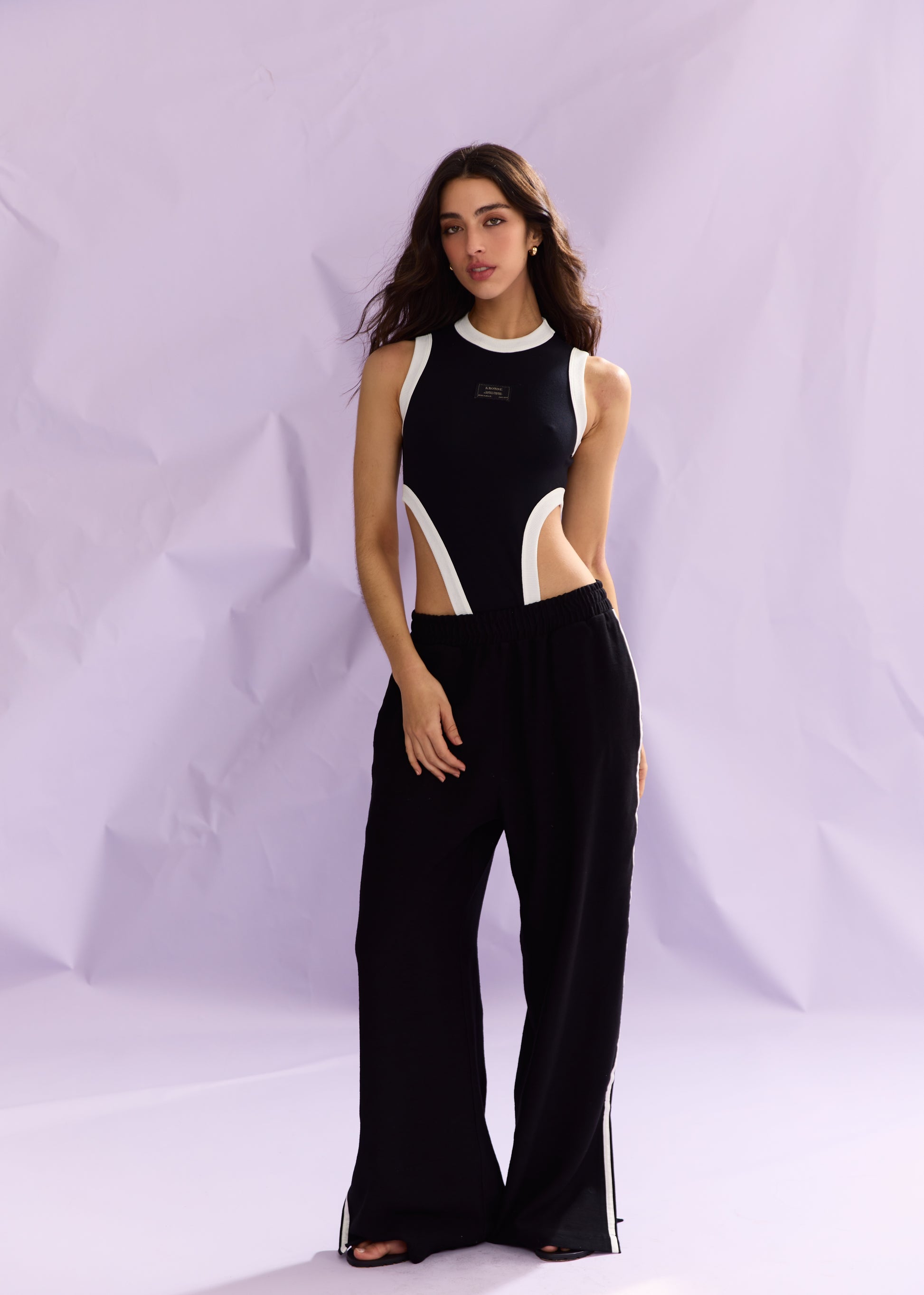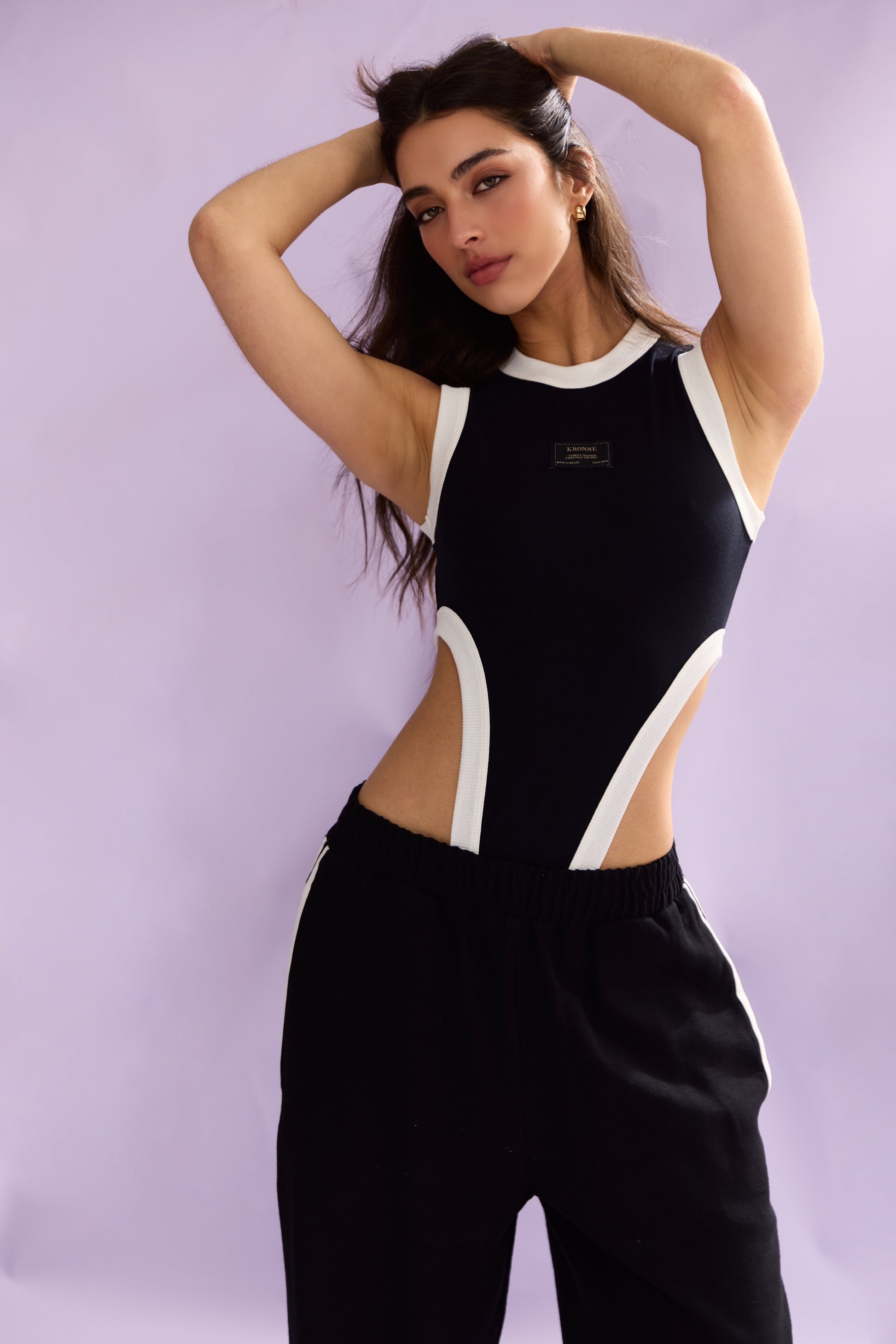 Body P&B com cava e detalhe de viés off-white. Tem gola redonda e etiqueta na frente. Confeccionado em malha premium.
