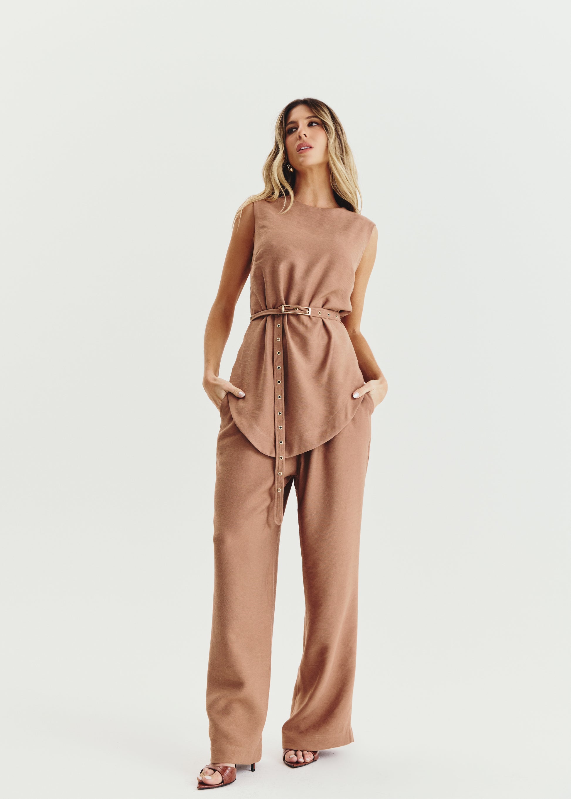 Calça cintura alta em alfaiataria, com bolsos e modelagem ampla.