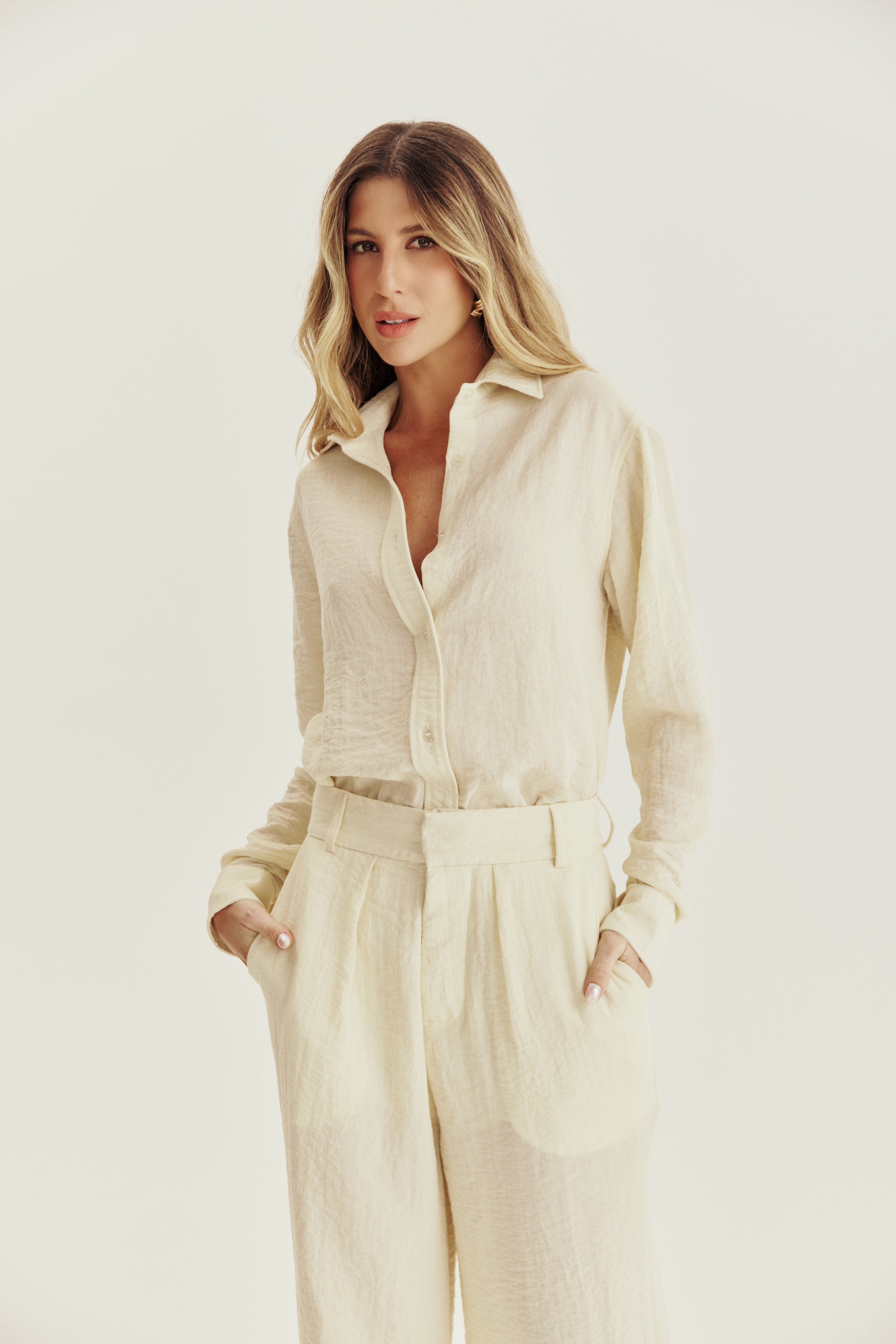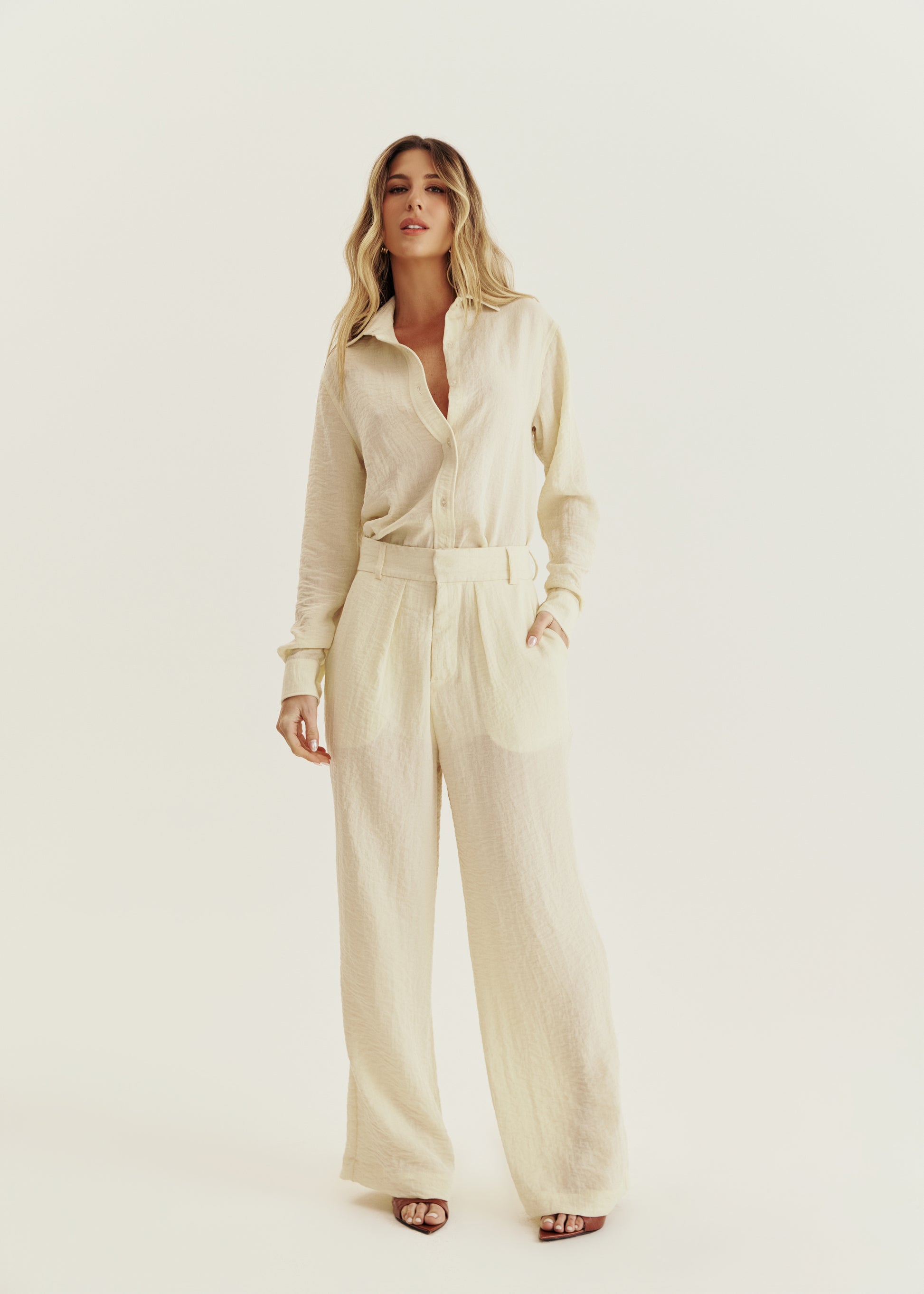 Calça alfaiataria com cintura alta, bolsos e pregas, confeccionado em crepe com leve textura.