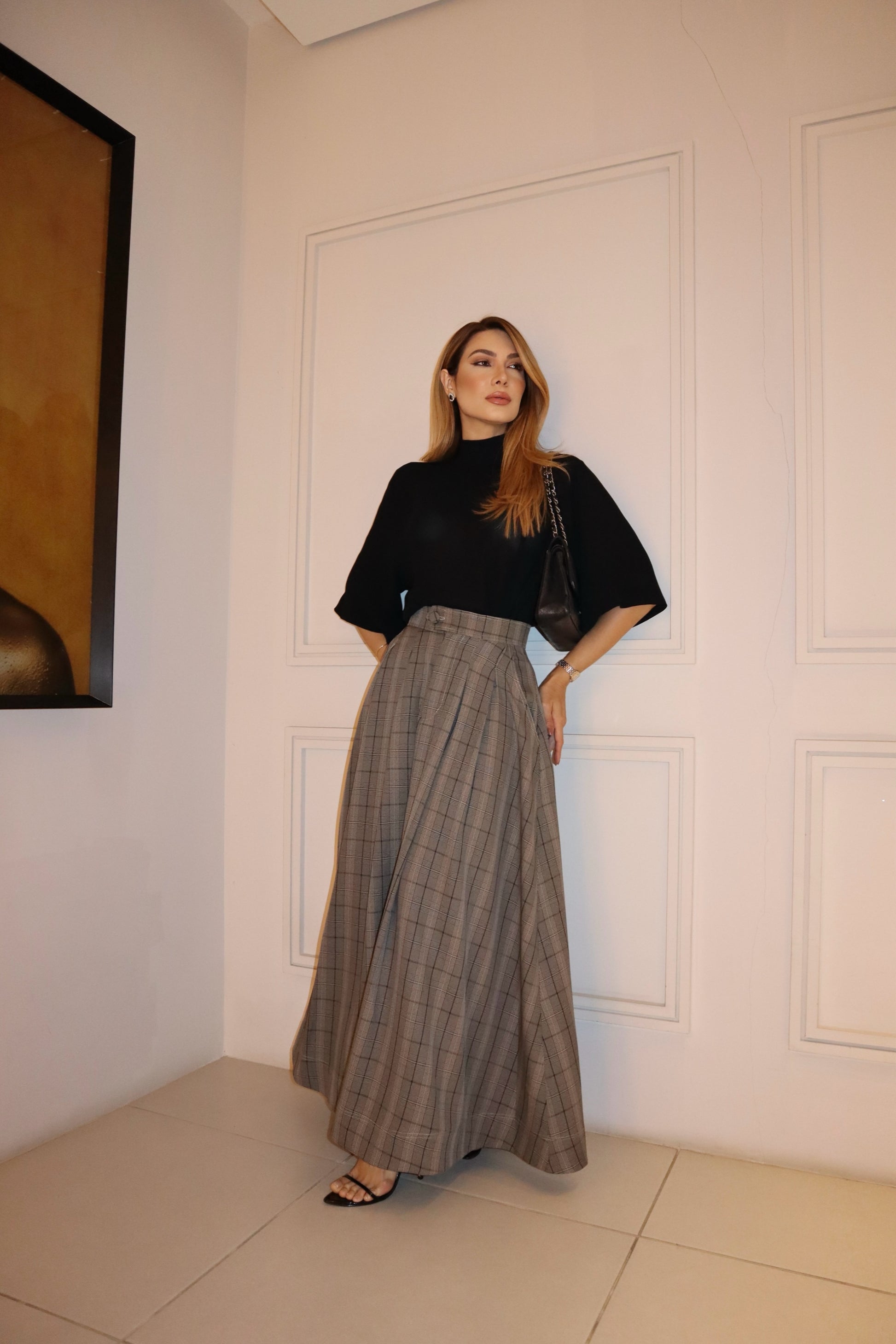 Feita em alfaiataria com fio tingido no padrão xadrez, a saia tem modelagem godê e pregas que trazem um caimento impecável. Tem acabamentos do cós pespontados.
