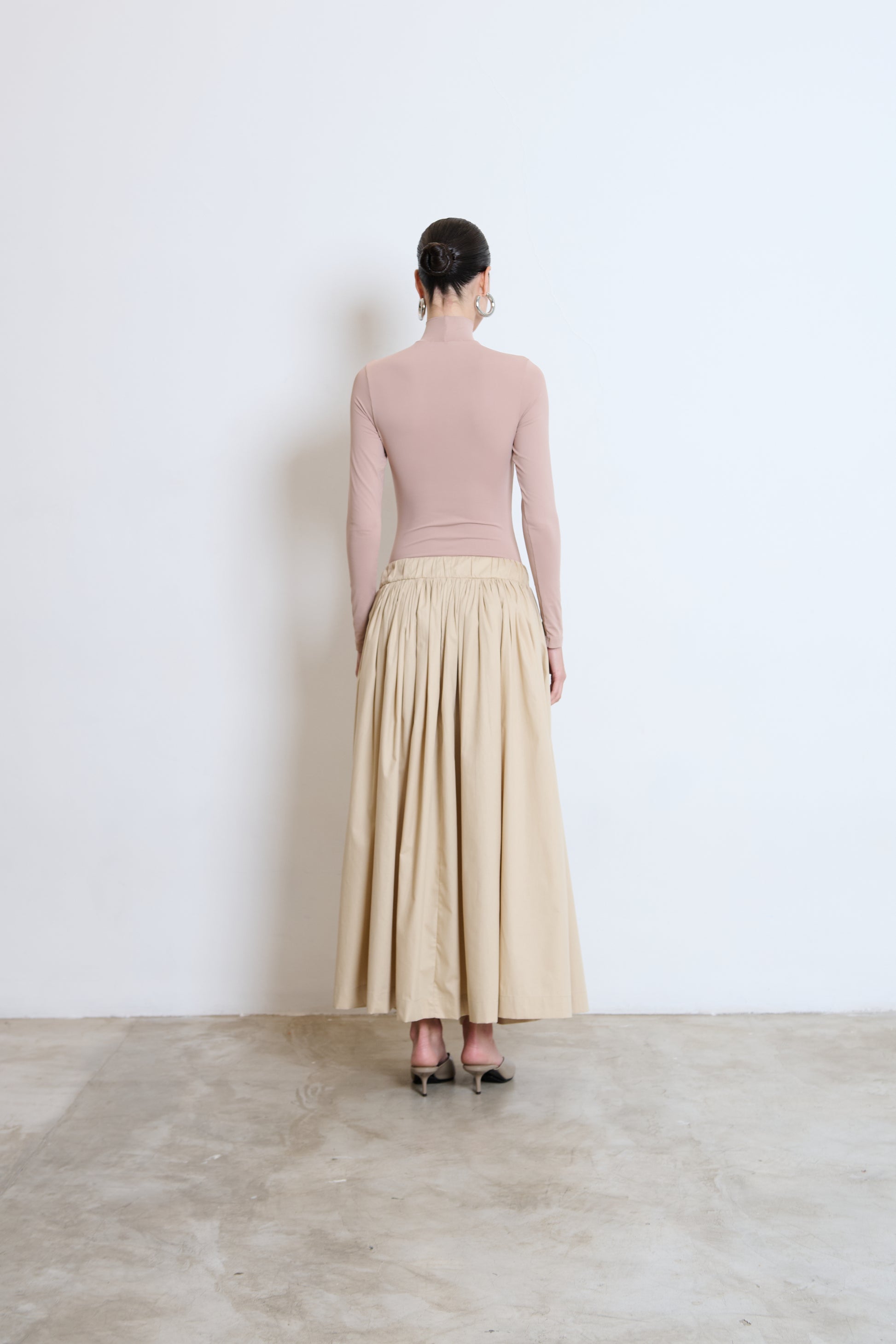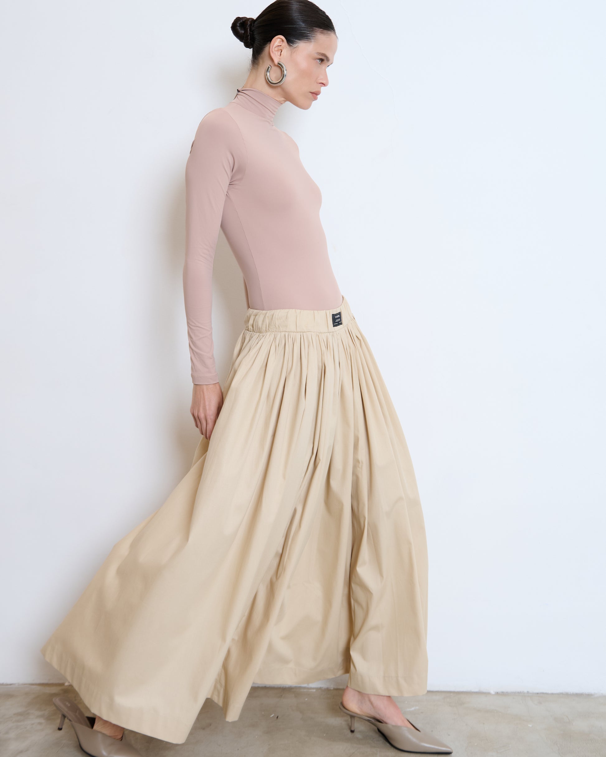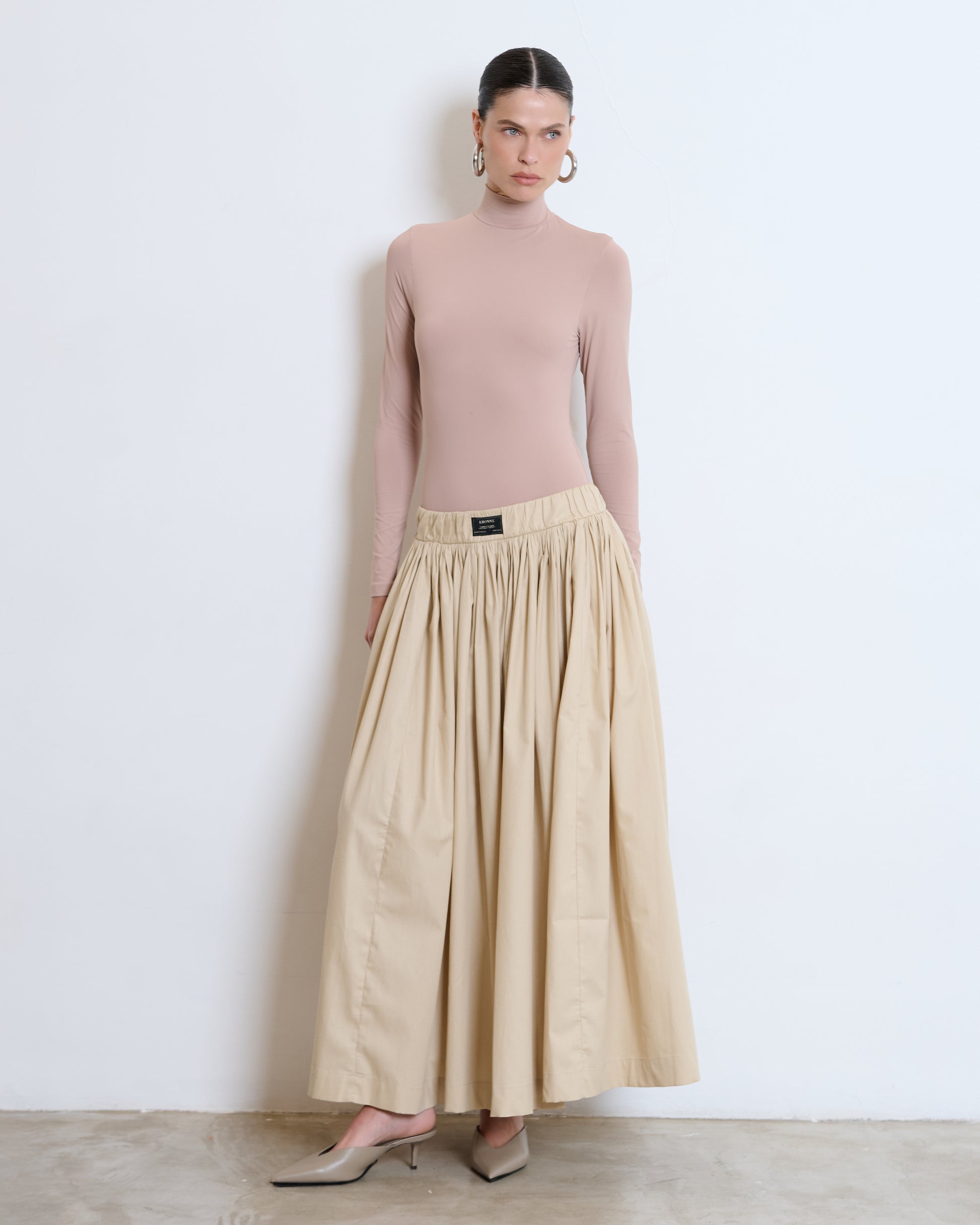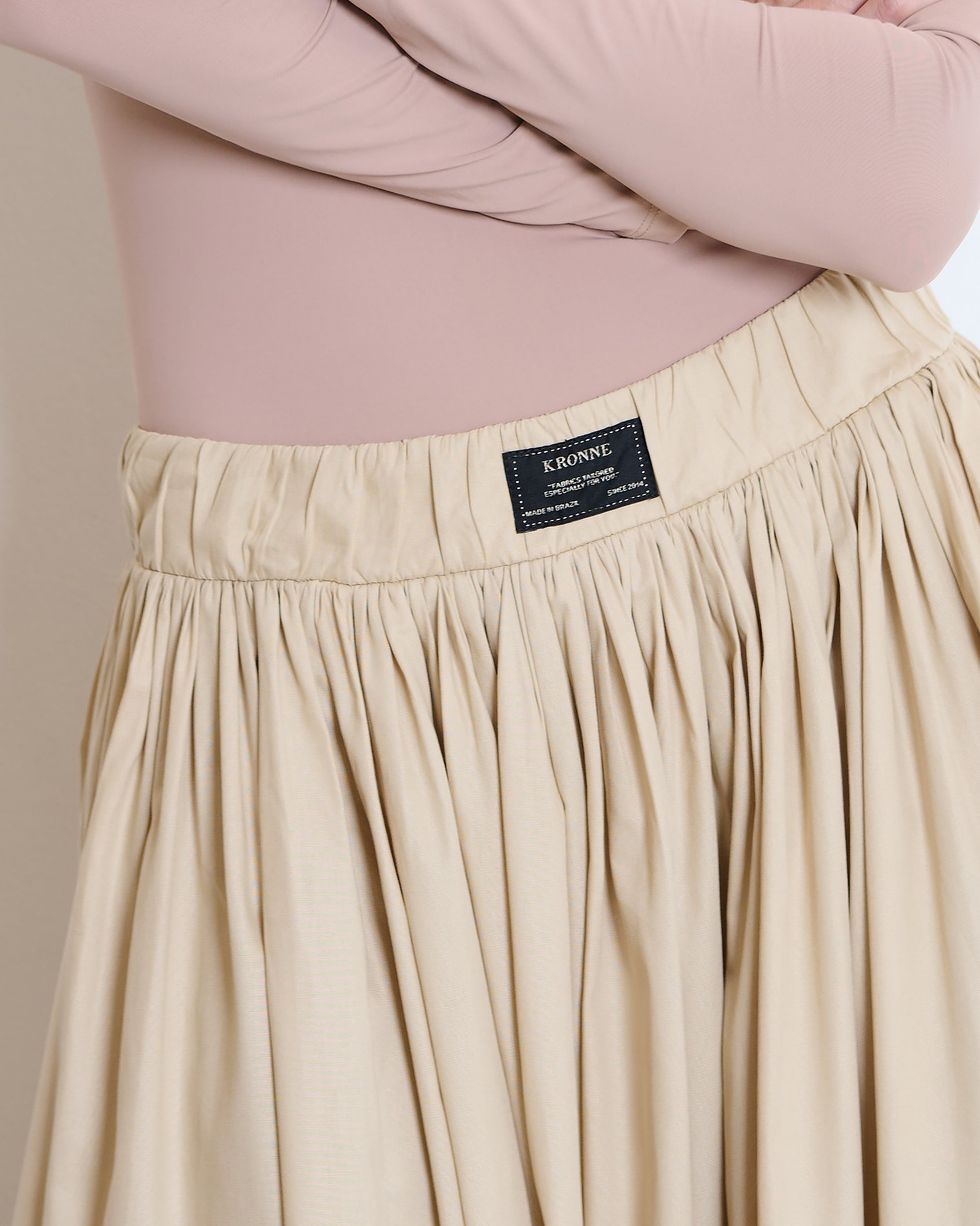 Saia cintura alta com cós de elástico etiqueta na frente.