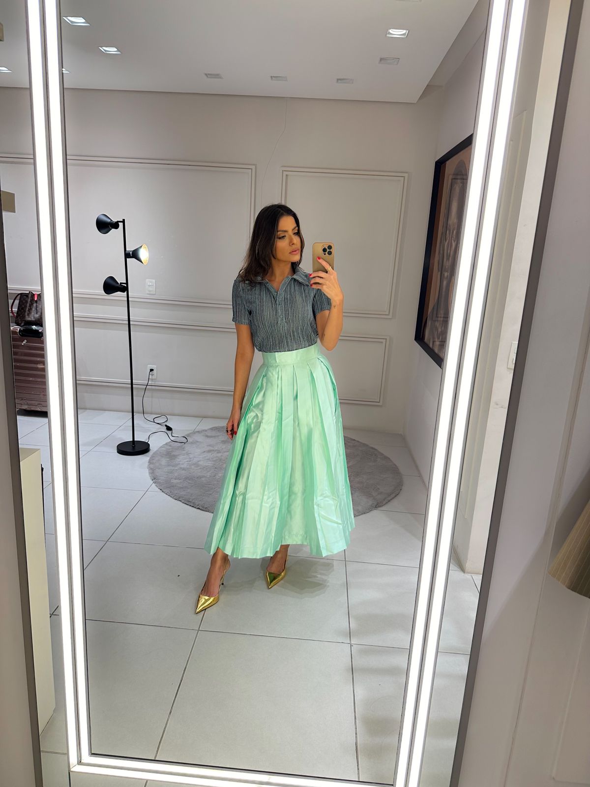 Saia cintura alta com pregas, possui zíper nas costas. Tecido estruturado